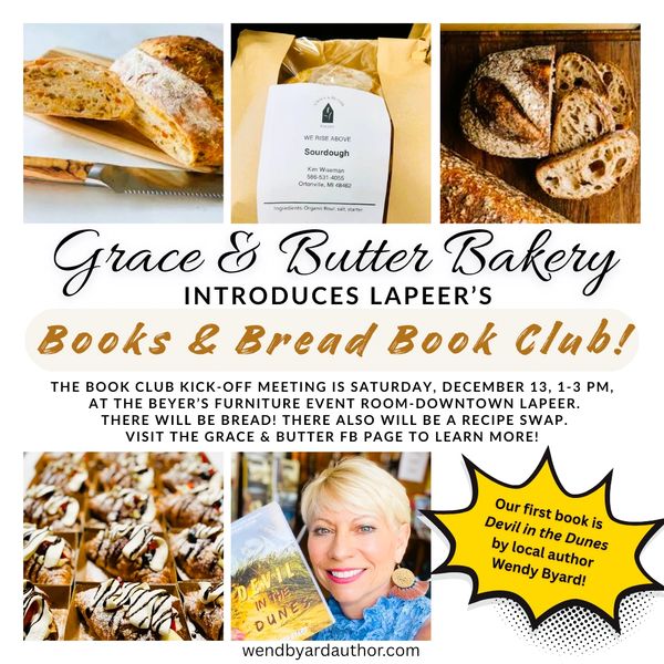 Sign m Wiseman, owner of the soon-to-open Grace & Butter bakery (across from the Lapeer Courthouse in downtown Lapeer, MI) is starting a new book club: Books & Bread. First kick-off meeting is Saturday, December 13, 1-3 PM at Beyer's event room in downtown Lapeer.